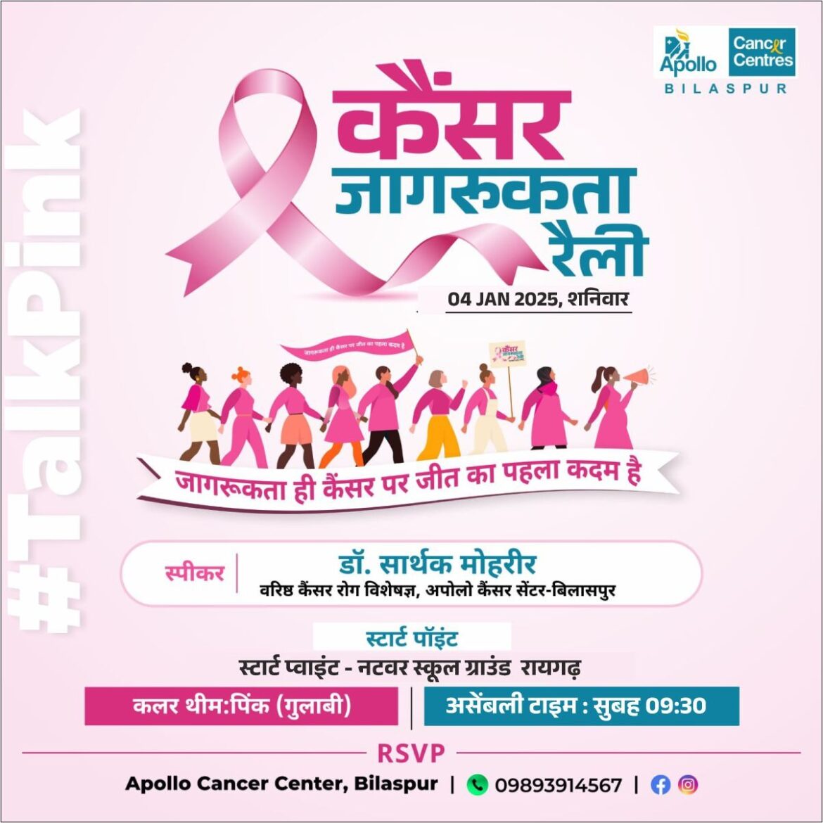 रायगढ़। बिलासपुर के अपोलो कैंसर सेंटर द्वरा चलाये जा रहे कैंसर जागरूकता अभियान के तहत रायगढ़ में 4 जनवरी को एक विशाल कैंसर जागरूकता रैली का आयोजन किया जा रहा है जिसमें रायगढ़ में प्रमुख महाविद्यालयों, एन एस एस, स्वस्थ विभाग, विप्र फाउंडेशन रायगढ़, मेडिकल कॉलेज, लॉयंस क्लब, ब्रह्मकुमारीज आध्यात्मिक संगठन एवम् विभिन्न सामाजिक संगठनों की भागीदारी सुनिश्चित की गई है। लगातार बढ़ रहे कैंसर मरीजों को जागरूक करने के लिये इस अभियान में राज्यसभा सदस्य देवेन्द्र प्रताप सिंह, जिला कलेक्टर कार्तिकेय गोयल के अलावा स्वास्थ्य विभाग के अधिकारी भी शामिल हो रहे हैं। इतना ही नही शहर के प्रमुख मार्गो से होते यह रैली नटवर स्कूल में जाकर समाप्त होगी। नटवर स्कूल में ही रैली के समापन के बाद हिंदी स्वस्तन परीक्षण नोटबुक का भी विमोचन किया जा रहा है। कार्यक्रम के आयोजक ने बताया कि यह जागरूकता रैली शनिवार सुबह साढ़े 9 बजे नटवर स्कूल से प्रारंभ होगी और विभिन्न चैक-चैराहों से होते हुए वापस नटवर स्कूल में ही समाप्त होगी। इस रैली में शामिल होनें के लिये शहर के सभी नागरिकों से भी अपील की गई है कि कैंसर जैसे गंभीर रोगों के लिये एक जागरूकता जन-जन तक पहुंचाने के लिये शामिल हो।