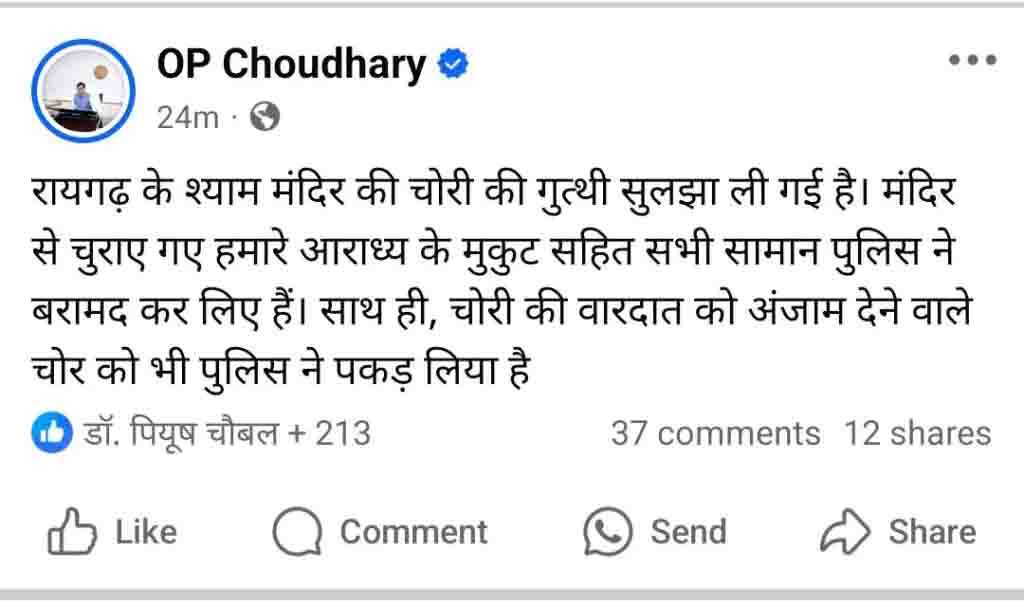 रायगढ़ विधायक एवं वित्त मंत्री ओपी चैधरी ने भी अपने फेसबुक एकाउंट में लिखा है कि रायगढ़ के श्याम मंदिर में चोरी की गुत्थी सुलझा ली गई है। मंदिर से चुराए गए हमारे आराध्य के मुकुट सहित सभी सामान पुलिस ने बरामद कर लिए हैं। साथ ही चोरी की वारदात को अंजाम देने वाले चोर को पुलिस ने पकड़ लिया है।
