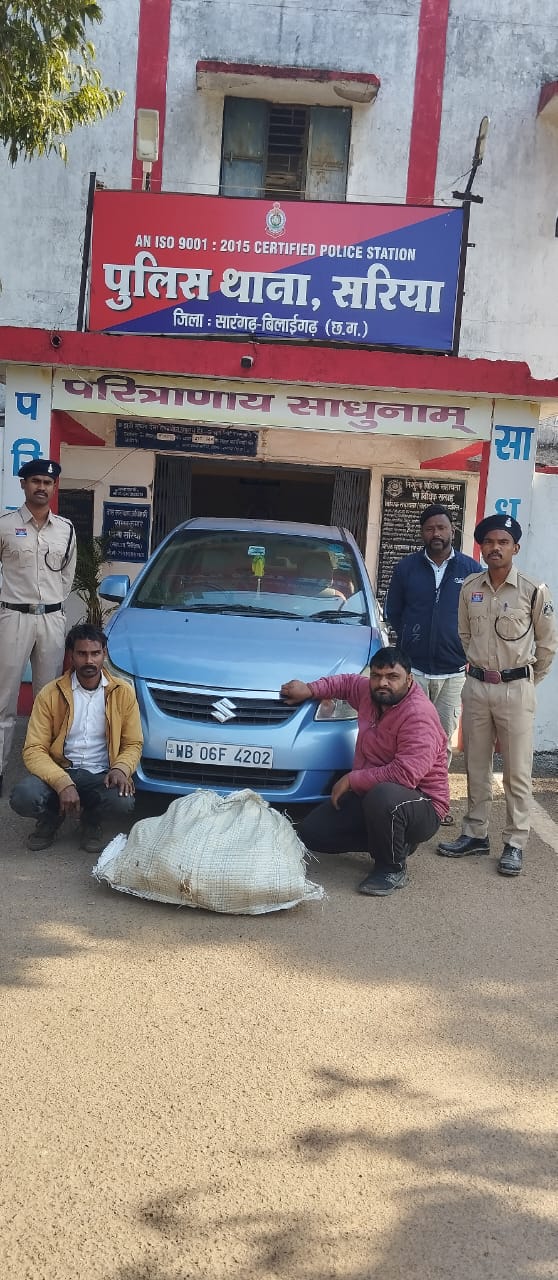 विवरण इस प्रकार है कि दिनांक 12/01/2026को दौरान पेट्रोलिंग जरिये मुखबीर सुचना मिला कि एक मारुति स्विफ्ट डिजायर कार क्रमांक WB06 F 4202 का चालक उड़ीसा से गांजा लेकर सरिया तरफ जा रहा है सूचना पर सरिया थाना के सामने मेन रोड में घेराबंदी कर कार क्रमांक WB 06 F 4202 को पकड़ा गया। कार चालक से नाम पता पूछने पर अपना नाम शीतल प्रकाश पिता संतोष कुमार पाठक सा मेडकी थाना मऊरानीपुर जिला झांसी (उत्तरप्रदेश) तथा ड्राइवर के बगल शीट में बैठे व्यक्ति ने अपना नाम कल्लू केेंवट पिता ध्रुवराम केवट मोहल्ला आजादपुरा थाना कोतवाली जिला कटनी ( मध्यप्रदेश ) का होना बताया। गवाहों के समक्ष स्विफ्ट डिजायर कार की तलाशी लेने पर कार में सफेद रंग के प्लास्टिक बोरी में भरा 25 पैकेट में 25 किलो 935 ग्राम अवैध मादक पदार्थ गांजा मिला। आरोपियों से पूछताछ करने पर जिला सोनपुर उड़ीसा से गांजा लेकर कटनी ,झांसी तरफ बिक्री हेतु ले जाना बताया किआरोपियों के कब्जे से 25 किलो 935 ग्राम अवैध मादक पदार्थ गांजा, 01नग स्विफ्ट डिजायर कार क्रमांक WB 06 F 4202 , 01 नग लावा कंपनी के मोबाइल को जप्त कर आरोपियों के खिलाफ थाना सरिया मे धारा 20 बी एनडीपीएस एक्ट पंजीबद्ध कर दोनों आरोपी को विधिवत् गिरफ्तार कर न्यायिक रिमांड पर जेल भेजा गया है।